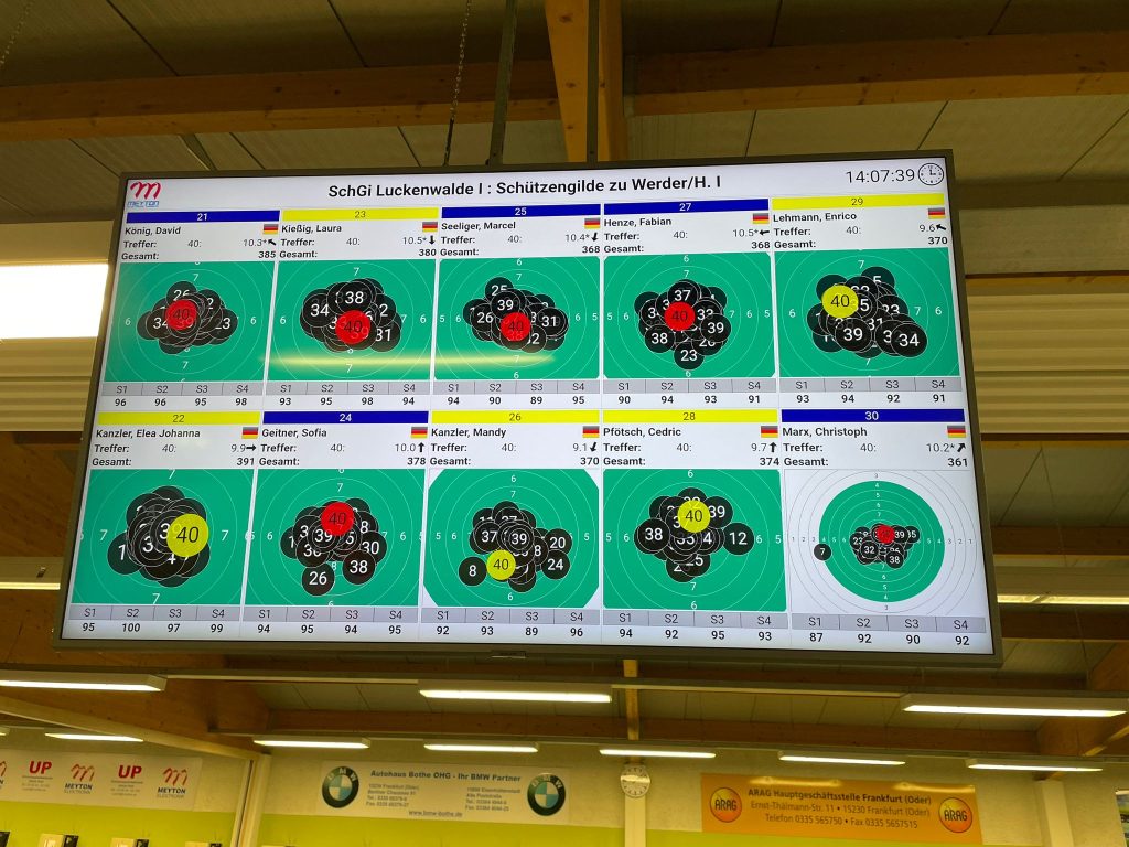 Bester Schütze in den Luckenwalder Reihen, David König, hatte zwar ein sehr starkes Ergebnis abgeliefert mit 385 Ringen, hatte aber gegen die zweitbeste Ligaschützin Elea Johanna Kanzler trotzdem keine Chance mit ihren 391 Ringen. An Position 2 wurde es schon knapper. Laura Kießig erzielte starke 380 Ringe und gewann damit gegen Sofia Geitner mit 378 Ringen und holte somit den ersten Einzelpunkt fürs Luckenwalder Team. An Position 3 fing Marcel Seeliger stark an mit einer 94er Serie, baute dann aber leider ab mit 2 schwachen Serien, mit der 4. Serie konnte er nochmal alles raushauen und schoss eine 95er Serie. Seiner Gegnerin Mandy Kanzler ging es ähnlich. Sie nutze die Zeit fast komplett aus und schoss ihren letzten Schuss 2 min. vor Ablauf der Zeit. So stand es am Ende 368 zu 370 von Kanzler.